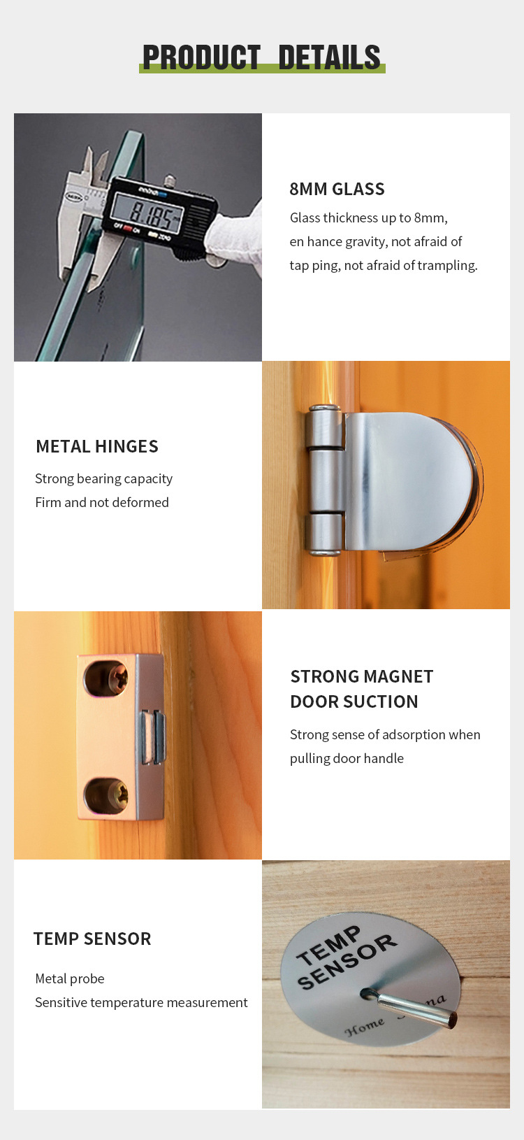 बलियो चुम्बक ढोका सक्शन: बलियो चुम्बक ढोका सक्शनको लागि धन्यवाद, १-३ व्यक्तिको काठ इन्फ्रारेड र स्टीम सौना कोठाको ढोकाको ह्यान्डल तान्दा शोषणको बलियो भावनाको अनुभव गर्नुहोस्। यसले इष्टतम सौना वातावरण कायम राख्दै ढोका सुरक्षित रूपमा बन्द हुने सुनिश्चित गर्दछ।