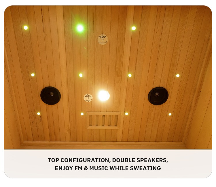FM रेडियो र संगीत प्लेब्याक समर्थन गर्दै, एक दोहोरो स्पिकर प्रणाली शीर्ष मा कन्फिगर गरिएको छ। पसिना बगाउँदा, इमर्सिभ सौना अनुभव अपग्रेड गर्दै तपाईं आफ्नो मनपर्ने धुन वा रेडियो कार्यक्रमहरूको आनन्द लिन सक्नुहुन्छ।