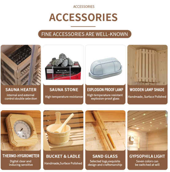अनुगमन र अनुभव सहायक उपकरणहरू: संवेदनशील तापक्रम र आर्द्रता मिटर, लग बालुवा टाइमर (समय + अनुष्ठान सेन्स), हातले पालिस गरिएको काठको बाल्टिन र लडल, परम्परागत सौना अनुष्ठानलाई पुनर्स्थापना गर्दै सुविधाजनक प्रयोग सुनिश्चित गर्दै।बाहिरी गिलास ढोका बाहिरी भाप कोठा.