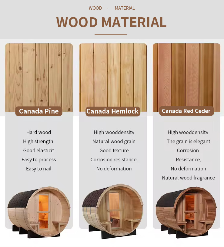 काठ अनुकूलन: उच्च गुणस्तरको क्यानाडाली आयातित बाहिरी-विशिष्ट काठ छनोट गर्दछ - पाइन (उच्च कठोरता, लागत-प्रभावी, एन्टी-क्रोसन उपचार गरिएको), हेमलक (उच्च घनत्व, नमी-प्रतिरोधी र विरूपण-प्रतिरोधी), र पश्चिमी रातो देवदार (प्राकृतिक रूपमा एन्टी-क्रोसिभ, बाहिरी काठको सुगन्ध, बाहिरी मौसमको बलियो सुगन्धको साथ)। को लागि वातावरणबाहिरी गिलास ढोका बाहिरी भाप कोठा.